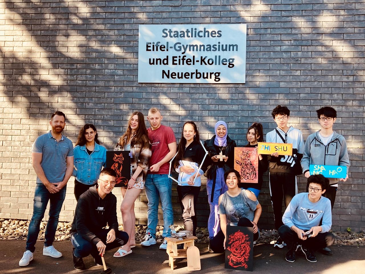 Kürzlich ging es für den Sprachkurs der Fortgeschrittenen ins Berufsbildungszentrum Bitburg. Hier wurde nach Herzenslust gesägt, geschraubt und gemalt: Traditionsgemäß dürfen nämlich die Lernenden in die unterschiedlichen Fachrichtungen des Berufsbildungszentrums hineinschnuppern. Im Mittelpunkt stand dabei der Umgang mit den Materialien Holz, Metall und Farbe. Begonnen wurde mit einer ordentlichen Schreinerarbeit: der Herstellung eines Schneidebrettes und eines Hockers für den täglichen Gebrauch. Im Anschluss erprobten die Schülerinnen und Schüler ihr Können im Bereich “Malen und Lackieren” durch die Herstellung eines Drachenbildes. Hier stand das Erlernen der richtigen Technik im Vordergrund und durch die geschickte Anleitung des zuständigen Meisters lernten die Neulinge schnell das nötige Knowhow.