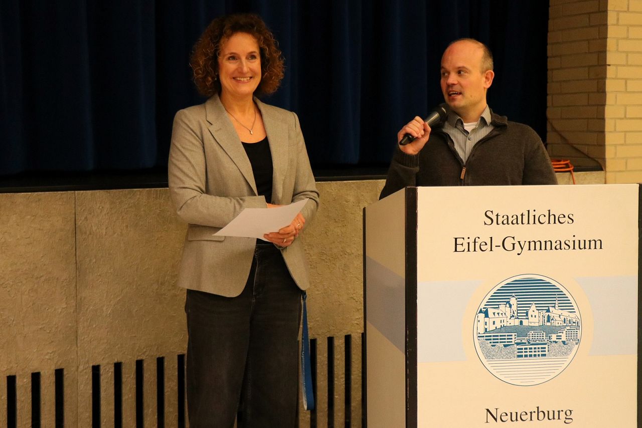 Im Anschluss bedankte sich Irina Flohr ausdrücklich bei Markus Kolf für die vertrauensvolle und gute Zusammenarbeit in den letzten Wochen und Monaten: Laut Irina Flohr hat Markus Kolf das Staatliche Eifel-Gymnasium nach Jens Kempers Wechsel zur Aufsichts- und Dienstleistungsdirektion Trier mit großer Ausgeglichenheit und Besonnenheit geführt, weiter sei sie glücklich, dass er weiterhin ihr Stellvertreter sei. Auch beim Kollegium sowie bei den Mitarbeitenden bedankt sich Flohr für die besondere und tatkräftige Unterstützung in der Übergangszeit.