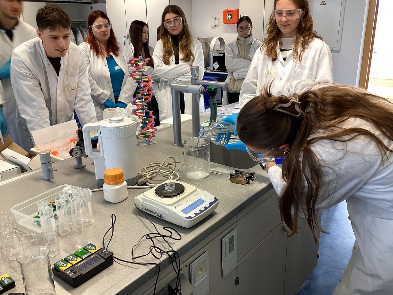 Geleitet wurde das Praktikum von Frau Julia Krüger und Herr Justus Gerber. Aufbauend auf einem kurzen Theorieblock inklusive Sicherheitsbelehrung machten sich die Schülerinnen und Schüler auf, die im Unterricht erlernten Fachinhalte der Molekulargenetischen Arbeitsweisen und Methoden nun im praktisch-experimentellen Teil zu erproben. Dazu wurden die weißen Laborkittel und die Gummihandschuhe angezogen und die Arbeit im Labor begann mit der Isolierung der eigenen DNA aus Zellen der Mundschleimhaut.