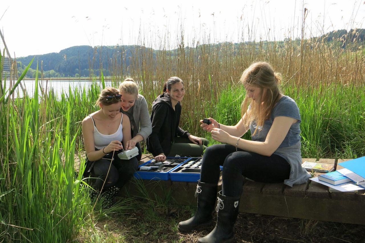 Dabei konnten die Schülerinnen und Schüler im nahe gelegenen Bettenfeld in den Laboren der dortigen Biologisch-Ökologischen Station (BÖS) Gewässerproben aus dem Meerfelder Maar untersuchen, die sie vorher selbst gezogen hatten. Zudem konnten bei ausgiebigen Erkundungen des Maares auch die Tier- und Pflanzenwelt sowie die Geologie dieses Naturschutzgebietes kennen gelernt werden. Der erste Tag begann direkt nach der Ankunft im Jugendgästehaus Bettenfeld und dem Beziehen der Zimmer mit der Begrüßung und Einweisung in der BÖS. Hier wurden die Schülerinnen und Schüler unter der fachkundigen Anleitung von Frau Karger, der Leiterin der BÖS, mit der Benutzung der Messtechnik und den Geräten zur Probenentnahme vertraut gemacht. Voller Elan und vollbepackt mit Geräten zur Werteerfassung, sowie zur Probenentnahme –inklusive Schlammbagger–verteilten sich die Gruppen anschließend auf die drei Stationen. So fuhr eine Gruppe bei bestem Wetter auf das Meerfelder Maar hinaus („Schwimmwesten nicht vergessen!“) und untersuchte das Pelagial (Freiwasserzone) auf chemisch-physikalische Parameter wie Temperatur, Sauerstoffgehalt, Beleuchtungsstärke, Leitfähigkeit und pH-Wert. Gemessen wurde von der Wasseroberfläche bis hinab auf den Grund des Maars in 17 Meter Tiefe. Hier kam auch der Schlammbagger zum Einsatz, mit dem eine ordentliche Portion Maarschlamm vom Maargrund zur späteren Untersuchung im Labor entnommen wurde. Mit dem RUTTNERschen Wasserschöpfer konnte Wasser aus verschiedenen Tiefen entnommen werden. In diesem wurden später im Labor die Gehalte an Nitrat, Phosphat und Ammonium in verschiedenen Wassertiefen bestimmt. Eine weitere Gruppe befasste sich mit dem Litoral (Uferbereich) des Maars. Hier galt es zunächst, Flora und Fauna des Uferbereichs zu erfassen, korrekt zu bestimmen und schließlich zu katalogisieren. In diesem Zusammenhang wurde auch ein Saprobienindex ermittelt. Hierdurch lässt sich anhand der gefundenen Arten an Kleinstlebewesen und Destruenten, sowie deren Anzahl eine Klassifizierung der Gewässergüte vornehmen. Eine chemisch-physikalische Analyse des Litoralwassers schärfte diese Bestimmung der Gewässergüte nochmals aus. Die dritte Gruppe befasste sich mit der Analysearbeit im Labor. Unter der kompetenten Betreuung durch den Biologisch-technischen Assistenten, Herrn Darwen, erhielten die Schülerinnen und Schüler hier spannende Einblicke in die praktische Analysearbeit mittels Fotometer. Auch konnten Planktonproben unter dem Mikroskop betrachtet und von ausgewählten Exemplaren eine mikroskopische Zeichnung angefertigt werden. Fünf besonders entdeckungsfreudige Schülerinnen fuhren sogar bereits morgens um fünf Uhr hinaus aufs Maar, um die nächtliche Sauerstoffzehrung in Abwesenheit von Sonnenlicht zu untersuchen.