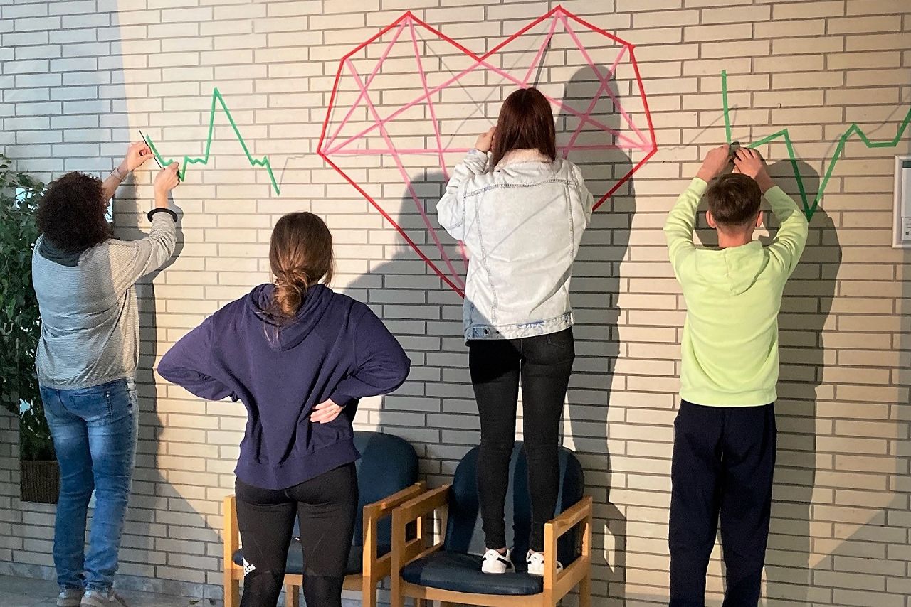 Drei versierte ReferenzkünstlerInnen für kulturelle Bildung des Landes Rheinland-Pfalz, Helen Jilavu, Erik Schmelz und Seweryn Zelazny , begleiteten das Projekt. Sie arbeiten im Kontext eines Konzeptes des Bildungs- und Kulturministeriums sowie der Stiftung „Mercator“ an der Schulentwicklung kreativ mit und schufen in unserem Internat den Rahmen dafür, dass die TeilnehmerInnen selbst zu Kunstschaffenden wurden, indem sie sowohl die Wände des Jungen- und Mädcheninternats als auch den Weg zur Mensa durch die Kunstform „Tape-Art“ verschönerten. Entstanden sind lebendige Werke aus buntem Klebeband im modernen „Pop-Art-Stil“ mit graphischen Mustern und markanten Zitaten. Diese positiven „Eingriffe“ in unsere Raumstrukturen und die „Okkupation des Raums durch die Schülerschaft“ sorgen für eine völlig neue Wahrnehmung des Raumes, der so zum “dritten Pädagogen” wird. Laut dem Künstlerteam geht es dabei nicht nur um äußere Räume, sondern auch um die Erfahrbarkeit für innere Räume: Mit welchen Begrenzungen lebt der Mensch? Stimmt die Seele des Raumes?
