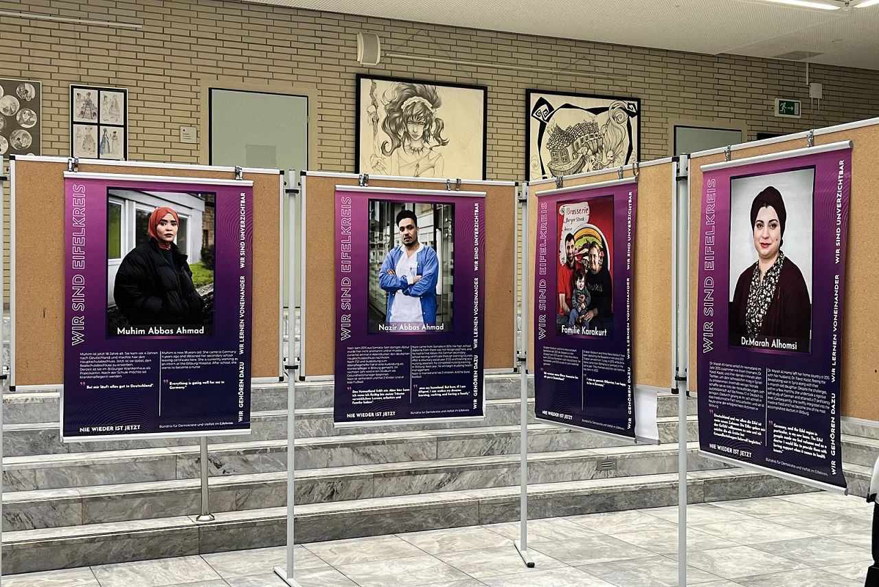 Die Ausstellung zeigt beispielsweise auch die Vita und den Werdegang von ehemaligen Sprachkursschülerinnen und -schülern, die am Staatlichen Eifel-Gymnasium durch das dortige Sprachkursangebot ihre ersten Schritte in Deutschland gemacht haben, Deutsch und vieles mehr gelernt haben und in unserer Region eine zweite Heimat gefunden haben.