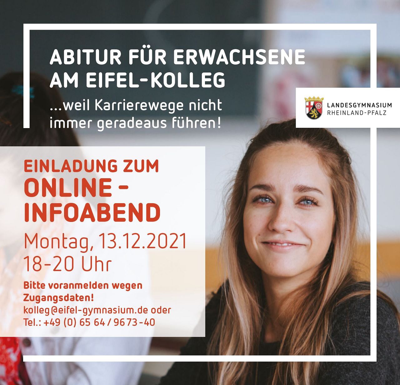 Sie erhalten an diesem Abend Informationen über die Bildungsangebote des Staatlichen Eifel-Kollegs Neuerburg und die Kollegleitung wird sich online mit Ihnen unterhalten: individuell und auf Ihre jeweilige persönliche und berufliche Situation zugeschnitten. Die Veranstaltung bietet Informationen über Aufnahmevoraussetzungen, Unterrichtsinhalte und Organisation.