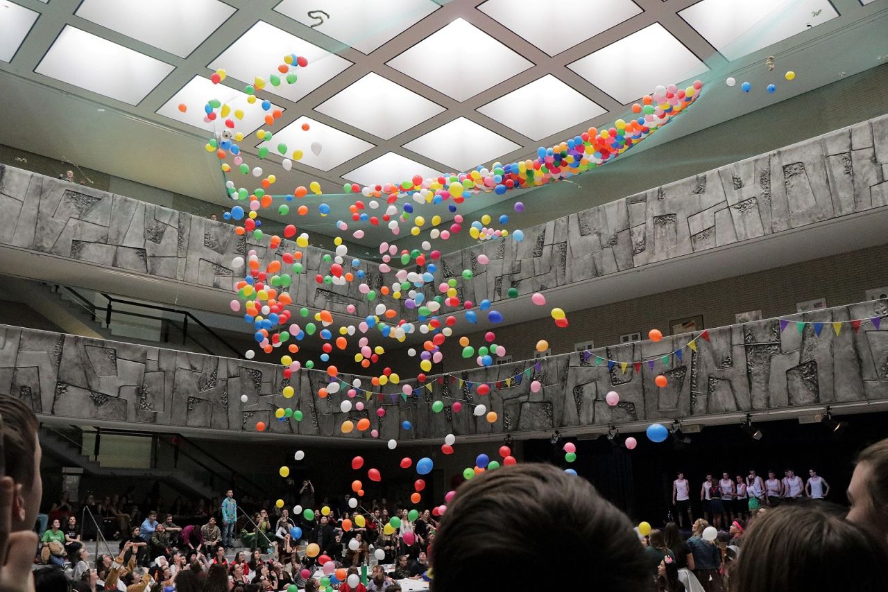 Die Feier gipfelte in einer Polonaise von Groß und Klein durch das Schulhaus, einem Kostümwettbewerb und einem Meer aus Luftballons.