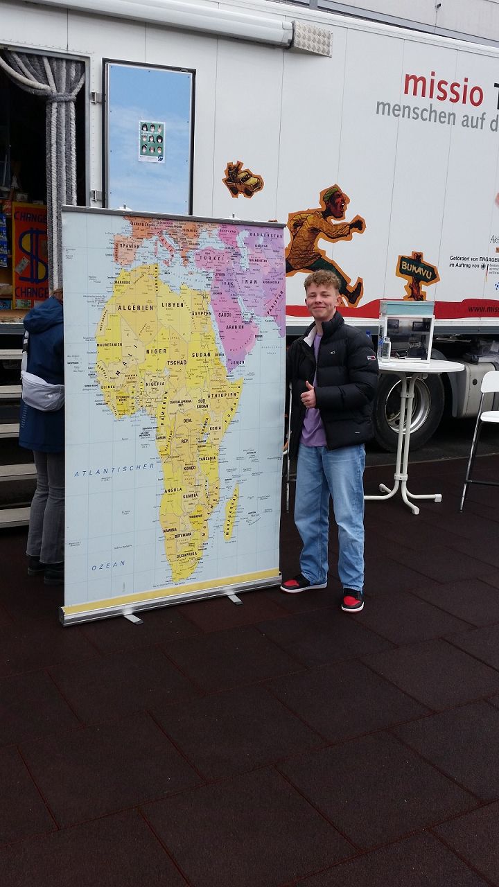 Am zweiten Tag stand der „Missio-Truck“ bereit, um das Themenfeld genauer zu ergründen: In Kleingruppen nahmen die SchülerInnen die mobile Ausstellung im Truckanhänger genauer unter die Lupe: Zuerst wurden mehrere kleine „Artikel“ von einem Markt im Kongo in Augenschein genommen. Danach durfte jeder eine Rollenkarte, auf der unterschiedliche Menschen, mit oder ohne Schulabschluss sowie unterschiedlichem Fluchthintergrund, abgebildet waren. Dann ging es in eine nachgestellte Kirche, in der man von einem animierten Priester passend zur Rolle erste Informationen über die Lage in der Region und einen Kontakt für einen möglichen Fluchtversuch mitgeteilt bekam. In anderen Ausstellungsräumen konnte man kleine „Aufgaben“ lösen oder beispielsweise eine Auswahl treffen, welche Gegenstände und Unterlagen man selbst auf einer Flucht mitnehmen würde. Auch multimediale Elemente, wie Videos oder Bilder von realen Flüchtenden, die ihre Flucht genauer thematisierten, veranschaulichten die beklemmende Wirklichkeit.