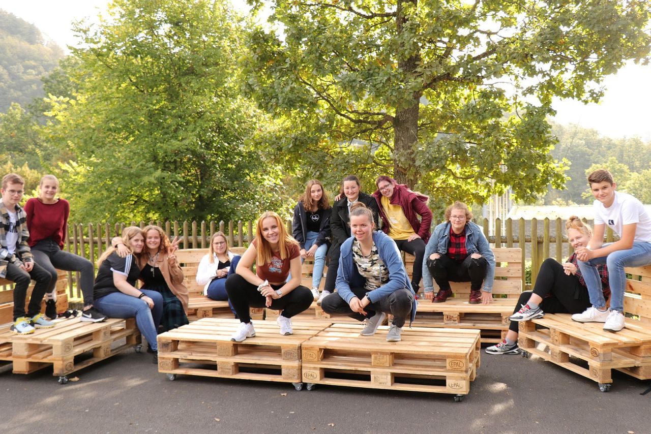 Das Fliesenfachgeschäft Arnold Wagner aus Kruchten hatte der SV dankenswerterweise 20 Europaletten gespendet, die Herr Enders, der Vater unserer Schülersprecherin Mia Enders, vorbeibrachte, und die sodann abgeschliffen, zusammengebaut und lackiert wurden. Entstanden sind so insgesamt fünf Couches und zwei Tische für unsere Schulhöfe.