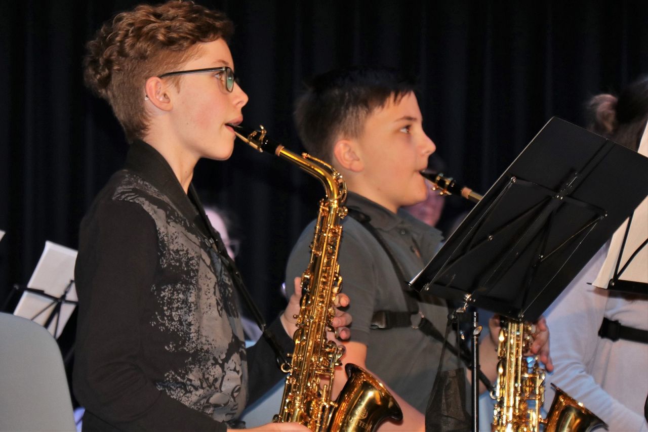 Celina Busshuven und Alexandra Shengkelia, begleitet durch Lisa Theisen, Patrik Rechin und Dorothea Nusbaum, machten mit „Just the way you are“ von Bruno Mars den Anfang und verzauberten mit diesem modernen Stück das Publikum. Im Anschluss stand in guter musikalischer Tradition die Virtuosität der Violine im Vordergrund. Melika Zare sorgte mit „New Moon“ aus der Twilight-Saga für ein hervorragendes Klangspektrum. Auch Sophie Ostermann stellte mit dem kecken Stück „Humoreske“ von Antonin Dvorak die Schönheit des Streichinstruments unter Beweis. Als nächstes sorgte der Schüler Zegu Yin u. a. mit seiner Interpretation des Beethoven-Stücks „Für Elise“ für einen absoluten Gänsehautmoment, der für tosenden Applaus sorgte. Tamara Zahren, eine ehemalige Schülerin des Gymnasiums und eine Könnerin am Bariton-Saxofon, machte mit „Pink Panther“ von Henry Mancini deutlich, dass der Swing auch im Jahr 2022 noch lebt.