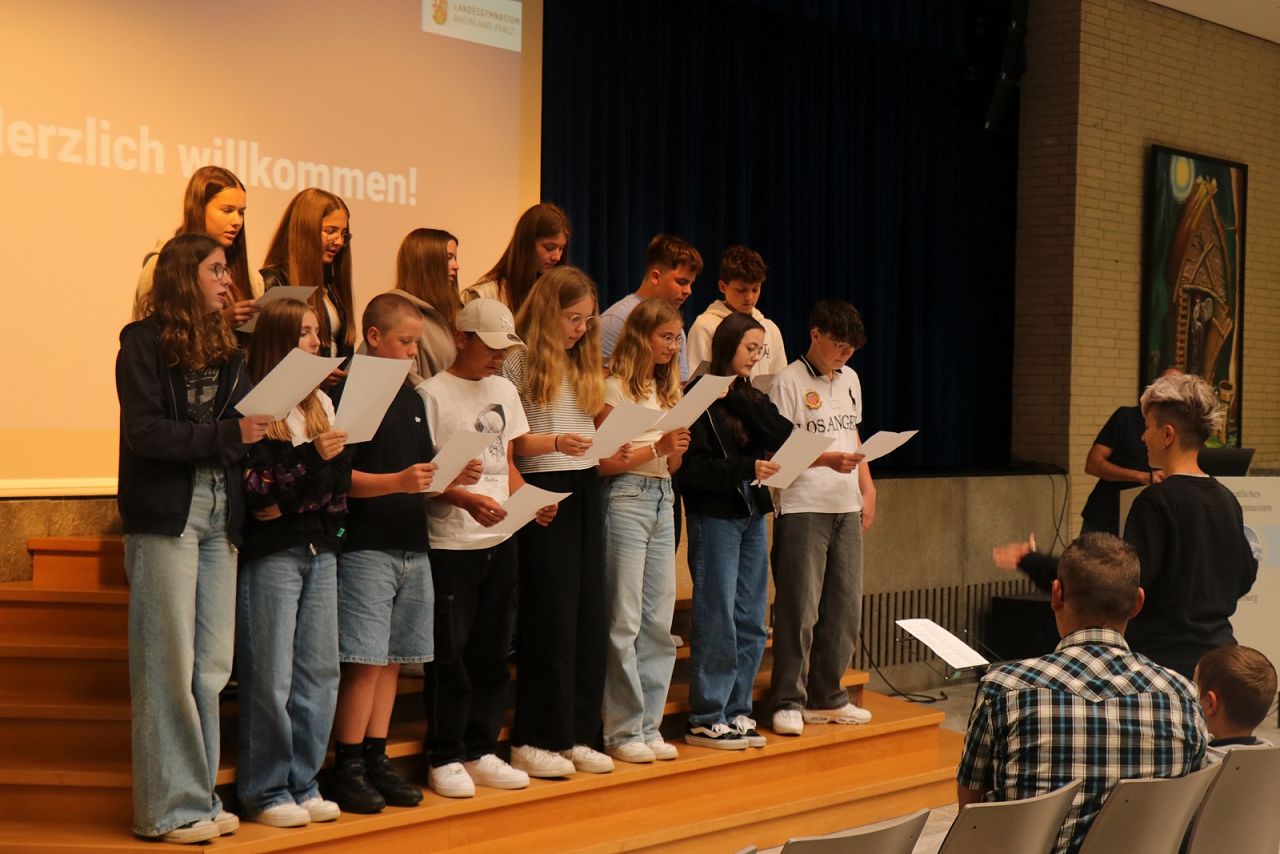 Auch die neuen Siebtklässlerinnen und Siebtklässler wurden am ersten Schultag, gemeinsam mit den Eltern, herzlich in Empfang genommen: In diesem Jahr versammelte sich die gesamte Schulgemeinschaft auf den Emporen des Atriums, um „unsere Jüngsten“ mit einem herzlichen Applaus in Empfang zu nehmen. Für Siebtklässlerinnen und Siebtklässler ist der Eintritt ins Eifel-Gymnasium ein besonderer Meilenstein des Schullebens. Schulleiter Jens Kemper und die Mittelstufenleiterin Irina Flohr wünschten den Neuankömmlingen und ihren Eltern einen „beflügelten Schulstart“ und werden ihnen im Namen des Fördervereins ein schuleigenes Hausaufgabenheft überreichen.