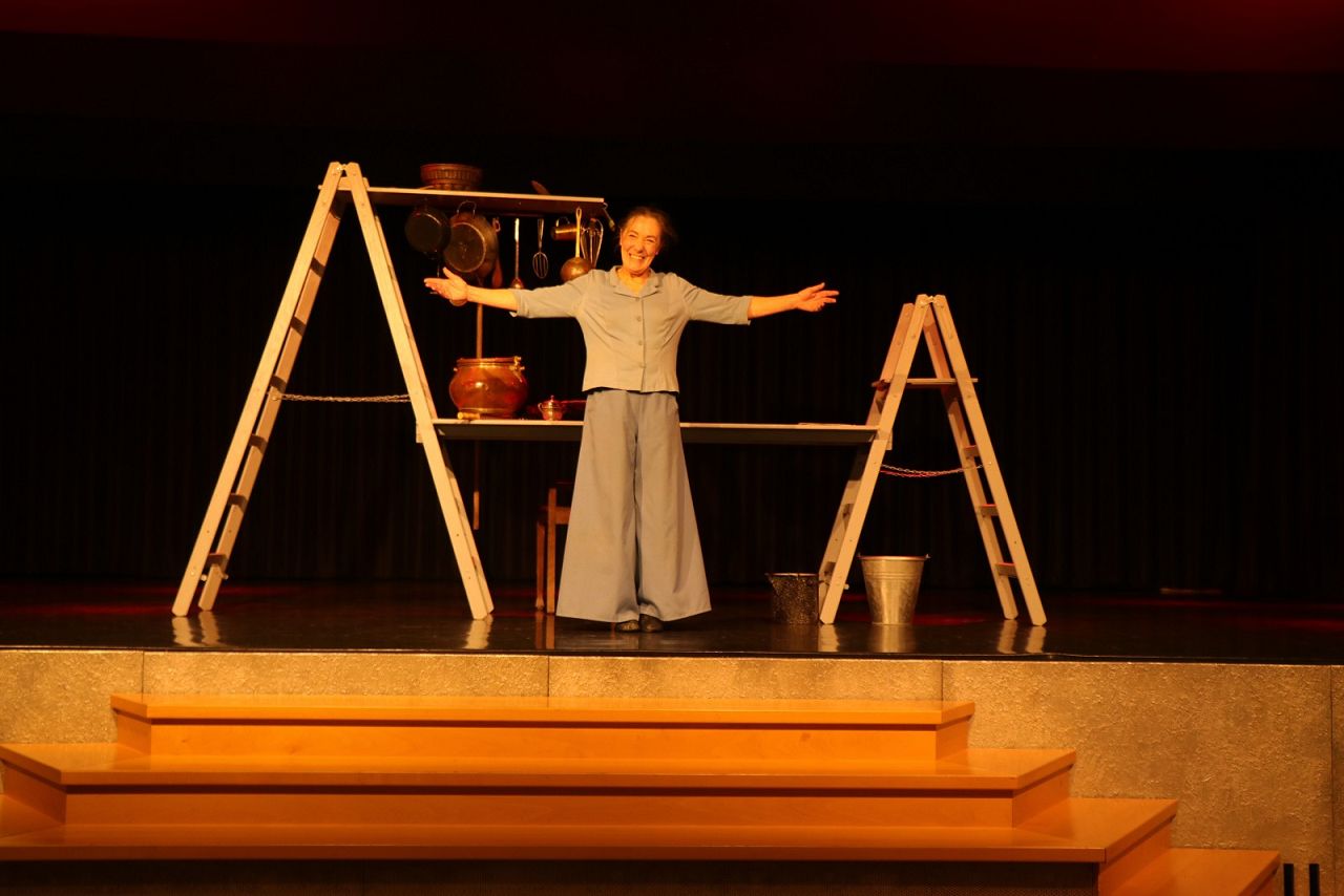 Sichtlich beeindruckt zeigten sich die Schülerinnen und Schüler von der Gesamtkonzeption der Inszenierung: Astrid Sacher sprühte vor Energie auf der Bühne und arbeitete stimmgewaltig mit unterschiedlicher Gestik und Mimik die einzelnen Rollen aus. Dabei griff sie auf eine gewaltige Textmenge zurück und gönnte sich keinerlei Pause: ob Vorspiel im Theater, Prolog im Himmel, des Pudels Kern, Osterspaziergang, Hexenküche, Liebesschwüre oder Hexentreffen – alles war dabei. Mit einem minimalistischen und zugleich sehr funktionellen Bühnenbild stellte sie sowohl Himmel, Studierzimmer als auch Wald und Höhle dar, tanzte auf der Walpurgisnacht und zeigte die Enge des totbringenden Kerkers. In diesem Rahmen beeindruckte Sacher mit dem durchdachten und zugleich kreativen Einsatz der Küchenutensilien als multifunktionale Requisite und Kostümierung und erweckte sogar den schwarzen Pudel zum Leben.