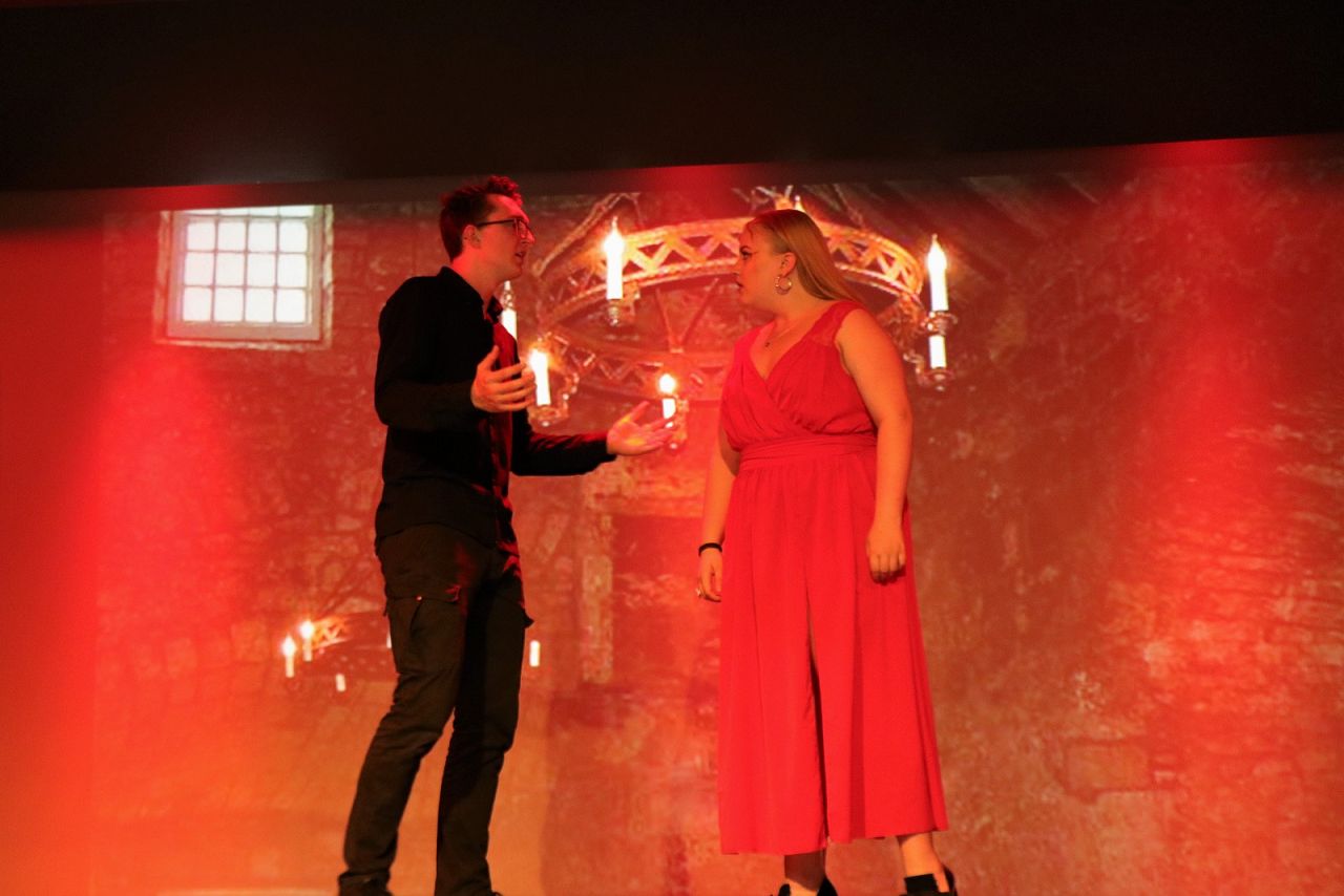 Ganz in schwarz gekleidet brillierte Wolf Hahm als Macbeth, der die Transformation vom hinterhältigen Königsmörder zum Opfer seiner eigenen Intrigen treffend darstellte. Die Rolle der mordlustigen und willensstarken Lady Macbeth wurde von Sita Kolb bemerkenswert leidenschaftlich und spielstark inszeniert. In roter Robe und getrieben durch Ehrgeiz stachelte sie als Ehefrau ihren Gatten zur Bluttat an. Diese Szenen einer Ehe voller Diskussionen zwischen dem “Thane” Macbeth und seiner Frau brachten das Publikum zum Schmunzeln. Schlussendlich ermordete Macbeth den guten König Duncan, gespielt von Jeremias Schütz, und trieb den rechtmäßigen Nachfolger ins Exil, um schließlich selbst König zu werden.