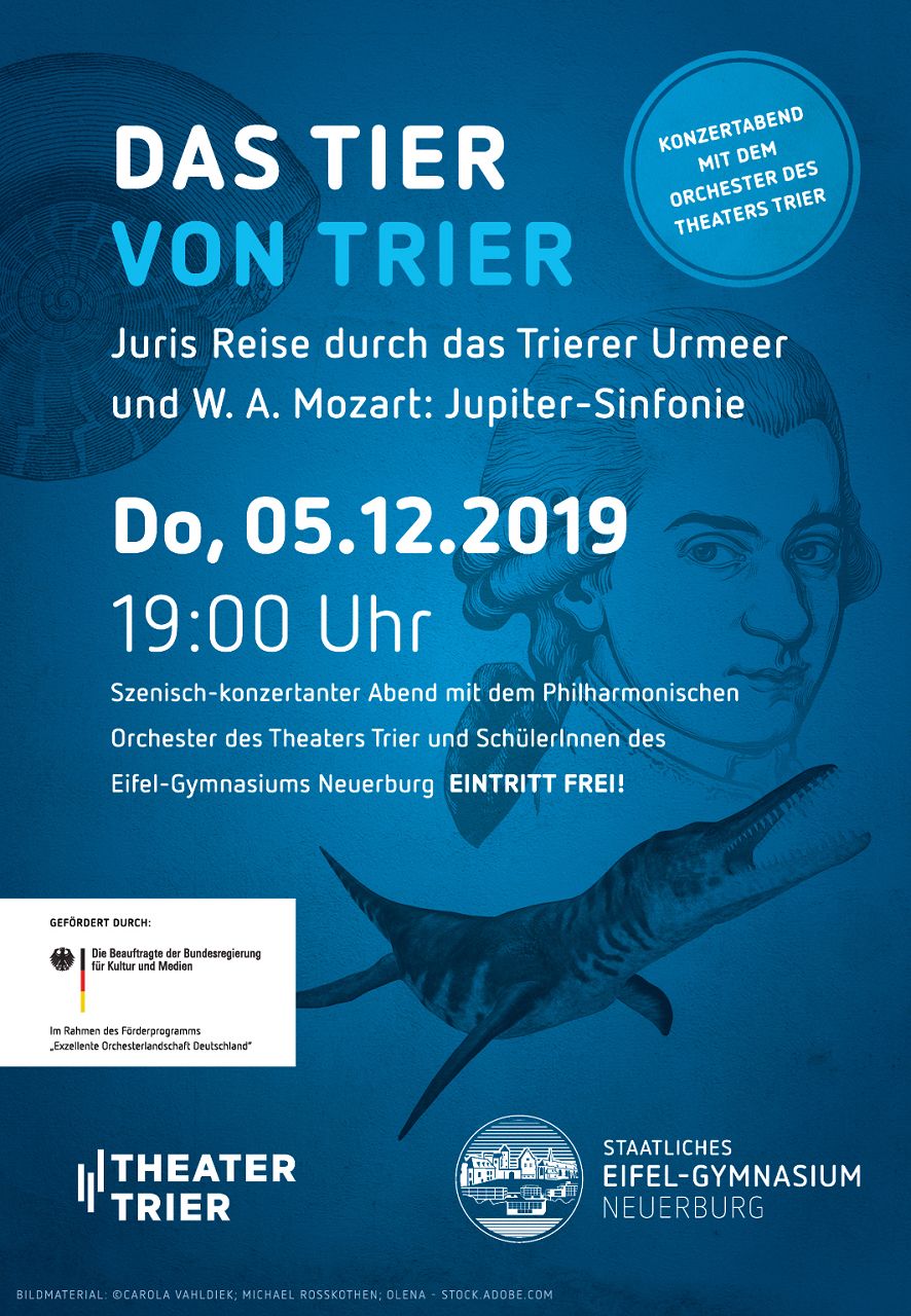 Unter der Leitung des Frankfurter Komponisten Hauke Berheide und mit Klängen des Trierer Orchesters können sich die Besucher dieser besonderen Veranstaltung auf eine Zeitreise ins Urmeer von Trier begeben. Juri, der Taucher, sucht auf dem Grund der Mosel nach einem Tier mit sagenhaftem Klangschatz und trifft dabei auf diverse Meeresbewohner, die ihn bei seinem Ziel, das große Festkonzert mitspielen zu dürfen, unterstützen.